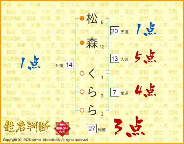 松(8画)森(12画) く(1画)ら(3画)ら(3画)