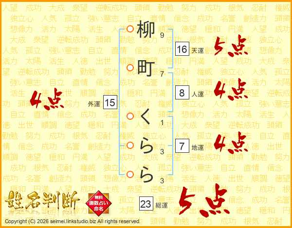 柳(9画)町(7画) く(1画)ら(3画)ら(3画)