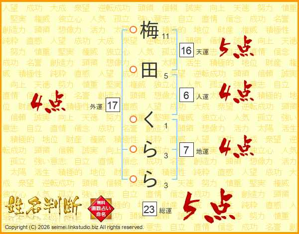 梅(11画)田(5画) く(1画)ら(3画)ら(3画)