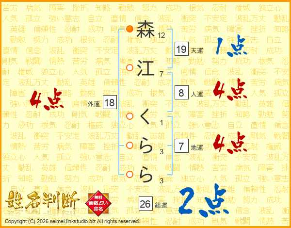 森(12画)江(7画) く(1画)ら(3画)ら(3画)