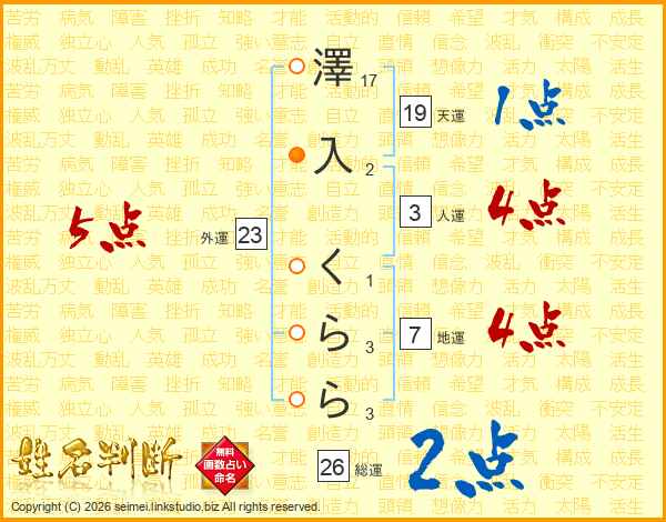 澤入くららさんの総運は26画の2点!