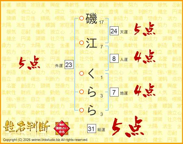 磯(17画)江(7画) く(1画)ら(3画)ら(3画)