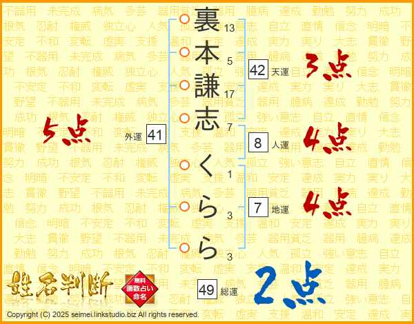 裏(13画)本(5画)謙(17画)志(7画) く(1画)ら(3画)ら(3画)