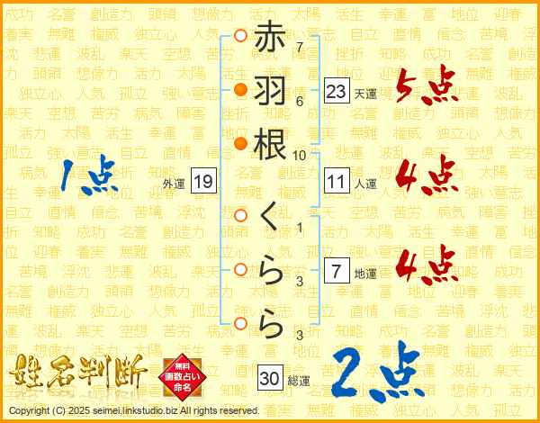 赤(7画)羽(6画)根(10画) く(1画)ら(3画)ら(3画)