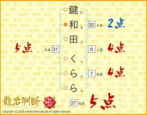 鍵(17画)和(8画)田(5画) く(1画)ら(3画)ら(3画)