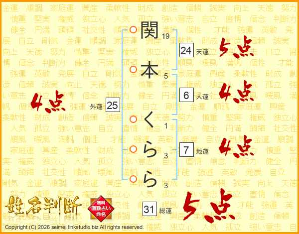 関本くららさんの総運は31画の5点!