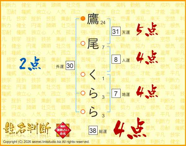 鷹(24画)尾(7画) く(1画)ら(3画)ら(3画)