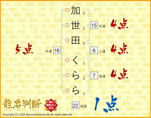 加(5画)世(5画)田(5画) く(1画)ら(3画)ら(3画)