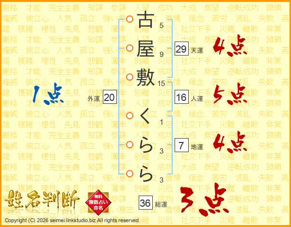 古屋敷くららさんの総運は36画の3点!