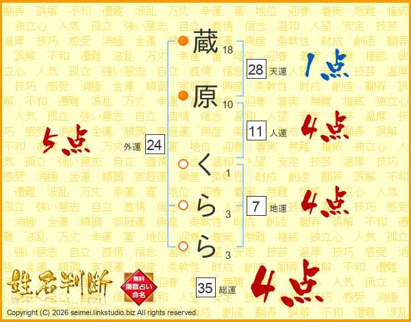 蔵(18画)原(10画) く(1画)ら(3画)ら(3画)