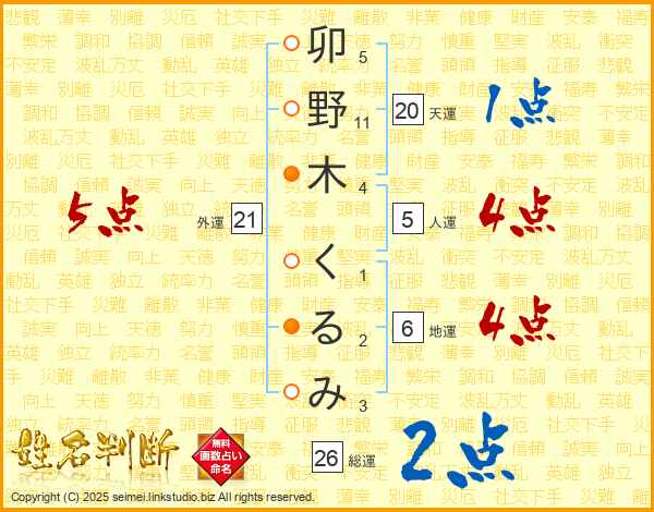 卯(5画)野(11画)木(4画) く(1画)る(2画)み(3画)
