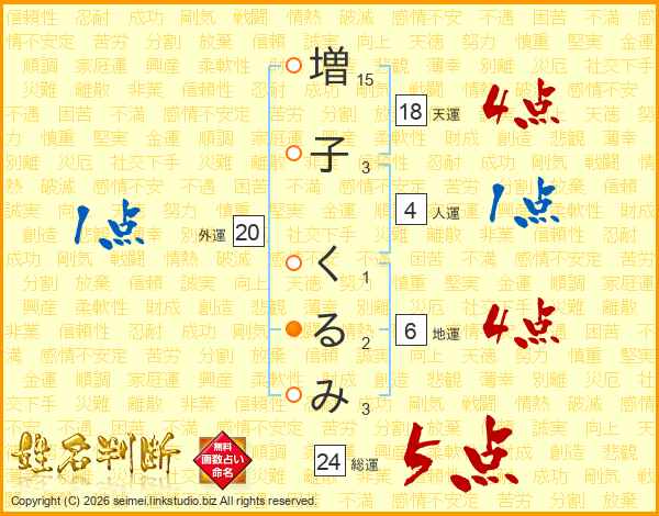増(15画)子(3画) く(1画)る(2画)み(3画)