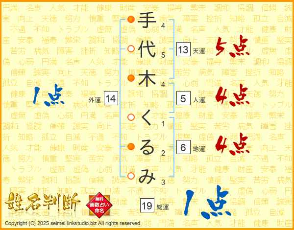 手(4画)代(5画)木(4画) く(1画)る(2画)み(3画)
