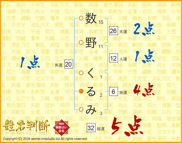 生活面を象徴する運勢です。外部から受ける影響力を表し、結婚運、家庭運や職場、環境への順応性を表します。総運から人運を引いた画数。姓や名が1文字の場合を除く。