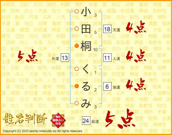 あなたの人生を表す1番重要な運勢です。生涯を通じて影響する総合運となり、主に50歳以降の晩年期に影響を及ぼします。苗字と名前の合計画数。