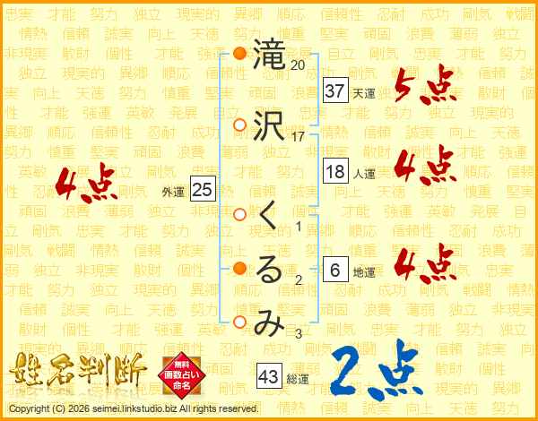 滝(20画)沢(17画) く(1画)る(2画)み(3画)