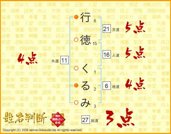 行(6画)徳(15画) く(1画)る(2画)み(3画)