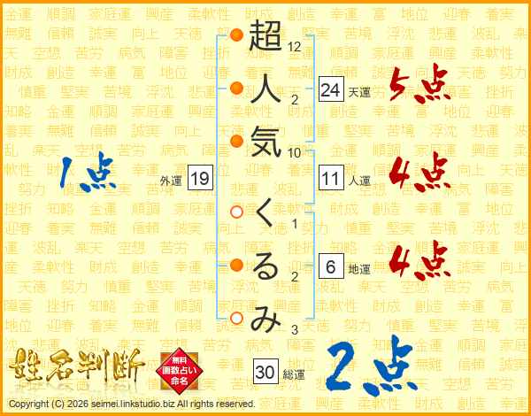 超人気くるみさんの天運は24画の5点!