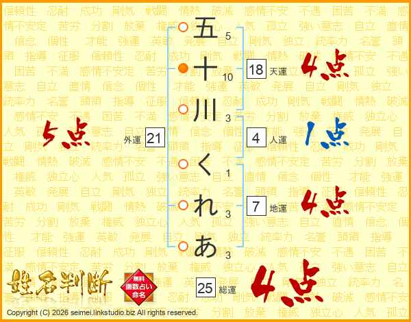 生活面を象徴する運勢です。外部から受ける影響力を表し、結婚運、家庭運や職場、環境への順応性を表します。総運から人運を引いた画数。姓や名が1文字の場合を除く。