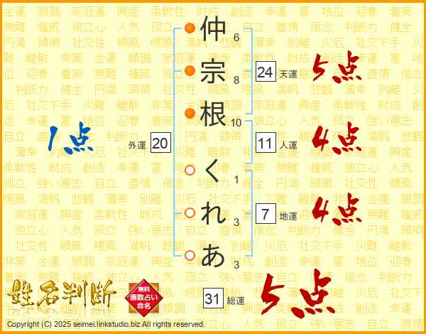 仲(6画)宗(8画)根(10画) く(1画)れ(3画)あ(3画)