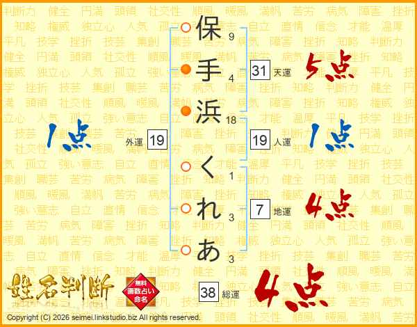 保手浜くれあさんの総運は38画の4点!