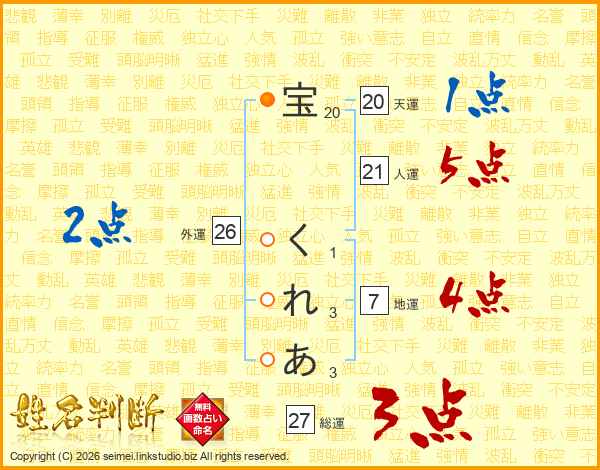 生活面を象徴する運勢です。外部から受ける影響力を表し、結婚運、家庭運や職場、環境への順応性を表します。総運から人運を引いた画数。姓や名が1文字の場合を除く。