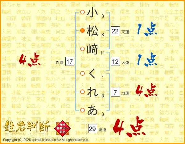 小松﨑くれあさんの総運は29画の4点!