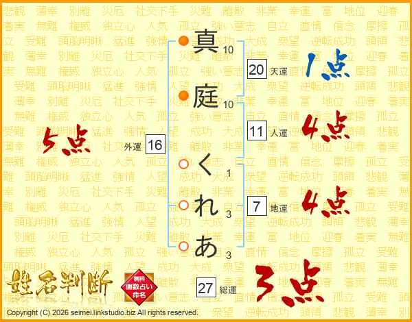 生活面を象徴する運勢です。外部から受ける影響力を表し、結婚運、家庭運や職場、環境への順応性を表します。総運から人運を引いた画数。姓や名が1文字の場合を除く。