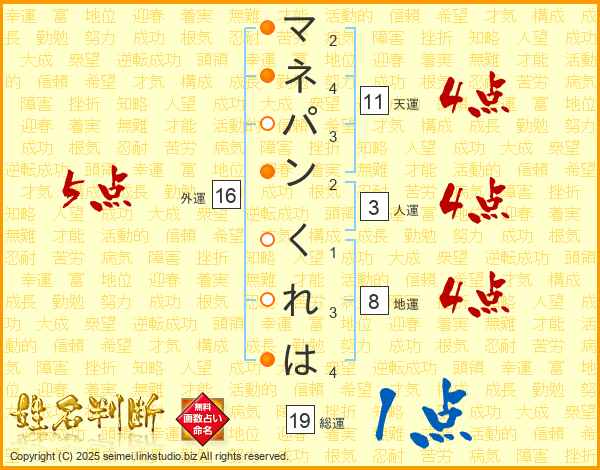 生活面を象徴する運勢です。外部から受ける影響力を表し、結婚運、家庭運や職場、環境への順応性を表します。総運から人運を引いた画数。姓や名が1文字の場合を除く。