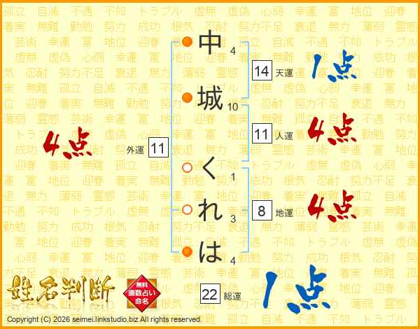 生活面を象徴する運勢です。外部から受ける影響力を表し、結婚運、家庭運や職場、環境への順応性を表します。総運から人運を引いた画数。姓や名が1文字の場合を除く。