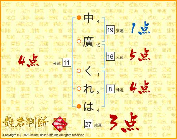 生活面を象徴する運勢です。外部から受ける影響力を表し、結婚運、家庭運や職場、環境への順応性を表します。総運から人運を引いた画数。姓や名が1文字の場合を除く。