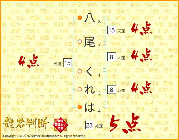八(8画)尾(7画) く(1画)れ(3画)は(4画)