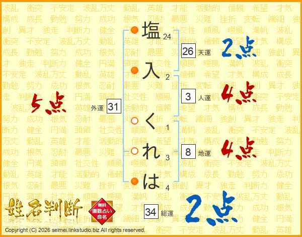 塩(24画)入(2画) く(1画)れ(3画)は(4画)