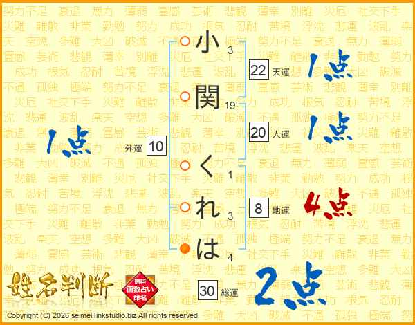 小関くれはさんの人運は20画の1点!