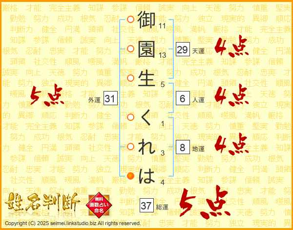 御(11画)園(13画)生(5画) く(1画)れ(3画)は(4画)