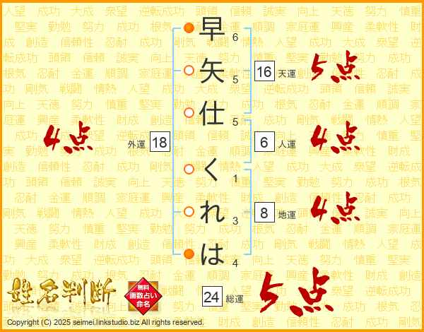 早(6画)矢(5画)仕(5画) く(1画)れ(3画)は(4画)