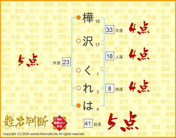 樺(16画)沢(17画) く(1画)れ(3画)は(4画)