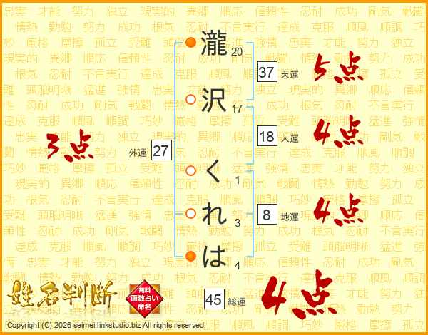 瀧沢くれはさんの総運は45画の4点!