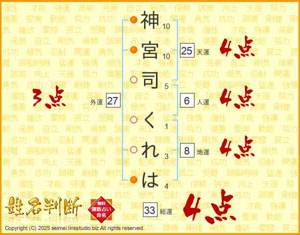 神(10画)宮(10画)司(5画) く(1画)れ(3画)は(4画)