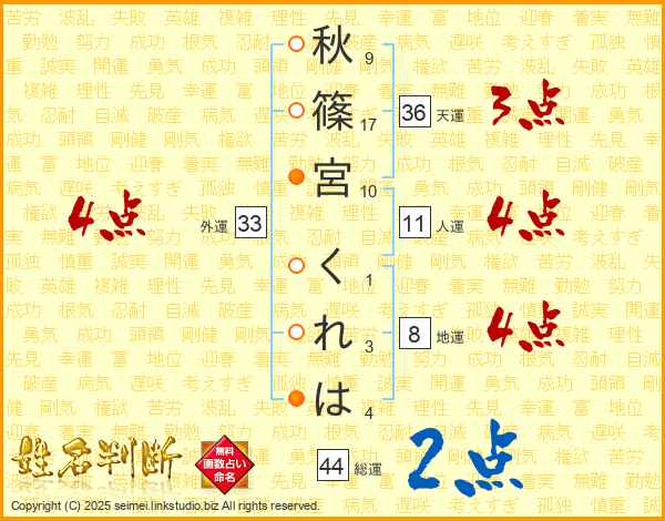 秋(9画)篠(17画)宮(10画) く(1画)れ(3画)は(4画)