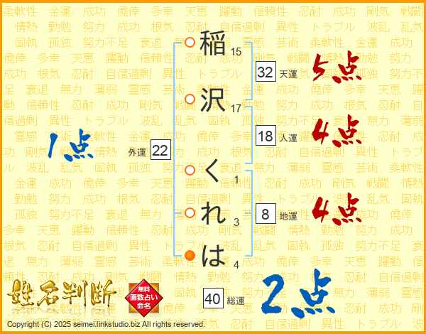 稲(15画)沢(17画) く(1画)れ(3画)は(4画)