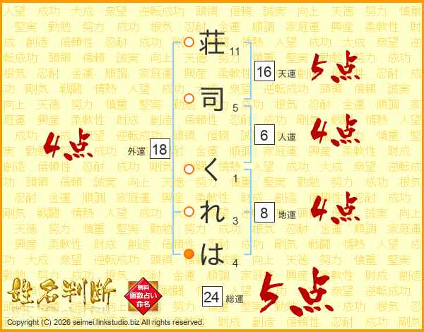 荘(11画)司(5画) く(1画)れ(3画)は(4画)