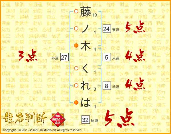 藤(19画)ノ(1画)木(4画) く(1画)れ(3画)は(4画)