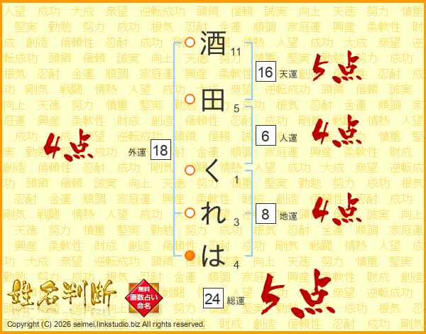 あなたの人生を表す1番重要な運勢です。生涯を通じて影響する総合運となり、主に50歳以降の晩年期に影響を及ぼします。苗字と名前の合計画数。