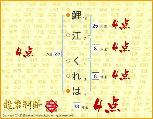 鯉(18画)江(7画) く(1画)れ(3画)は(4画)