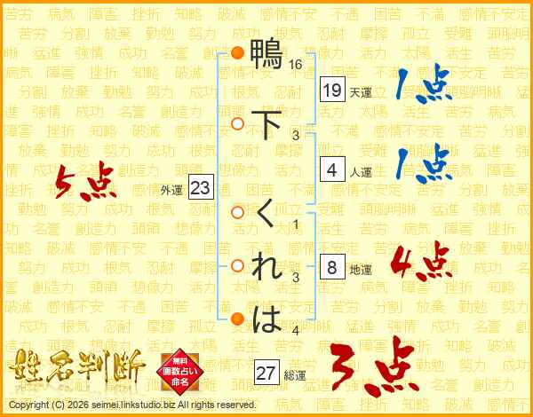 鴨(16画)下(3画) く(1画)れ(3画)は(4画)