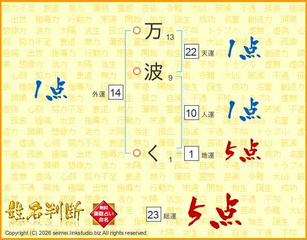生活面を象徴する運勢です。外部から受ける影響力を表し、結婚運、家庭運や職場、環境への順応性を表します。総運から人運を引いた画数。姓や名が1文字の場合を除く。
