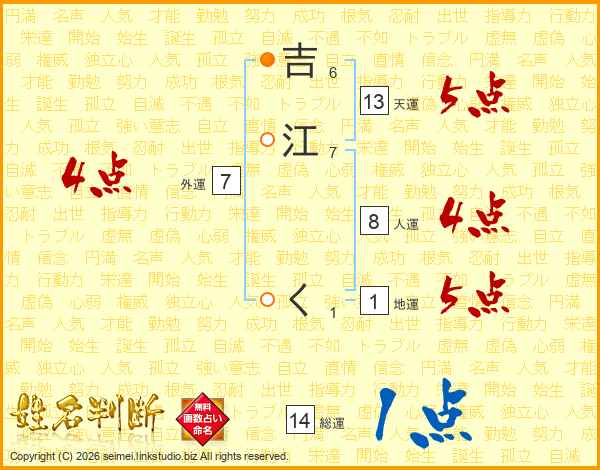 生活面を象徴する運勢です。外部から受ける影響力を表し、結婚運、家庭運や職場、環境への順応性を表します。総運から人運を引いた画数。姓や名が1文字の場合を除く。