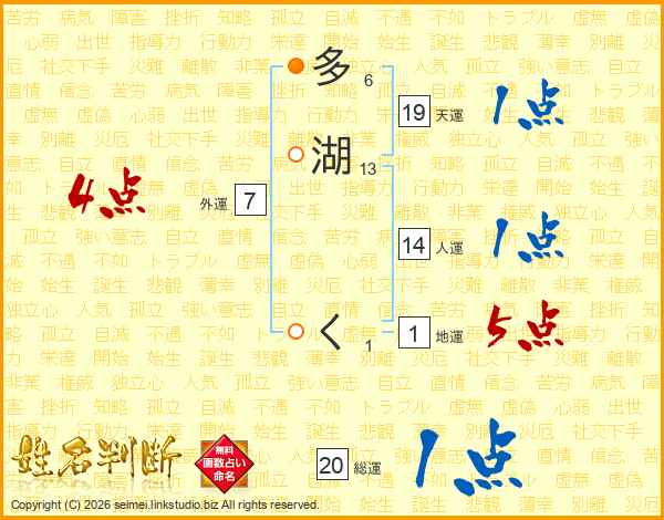 生活面を象徴する運勢です。外部から受ける影響力を表し、結婚運、家庭運や職場、環境への順応性を表します。総運から人運を引いた画数。姓や名が1文字の場合を除く。