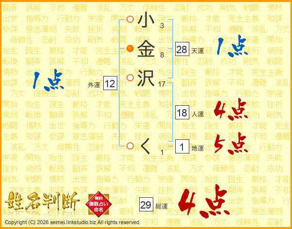 小金沢くさんの総運は29画の4点!